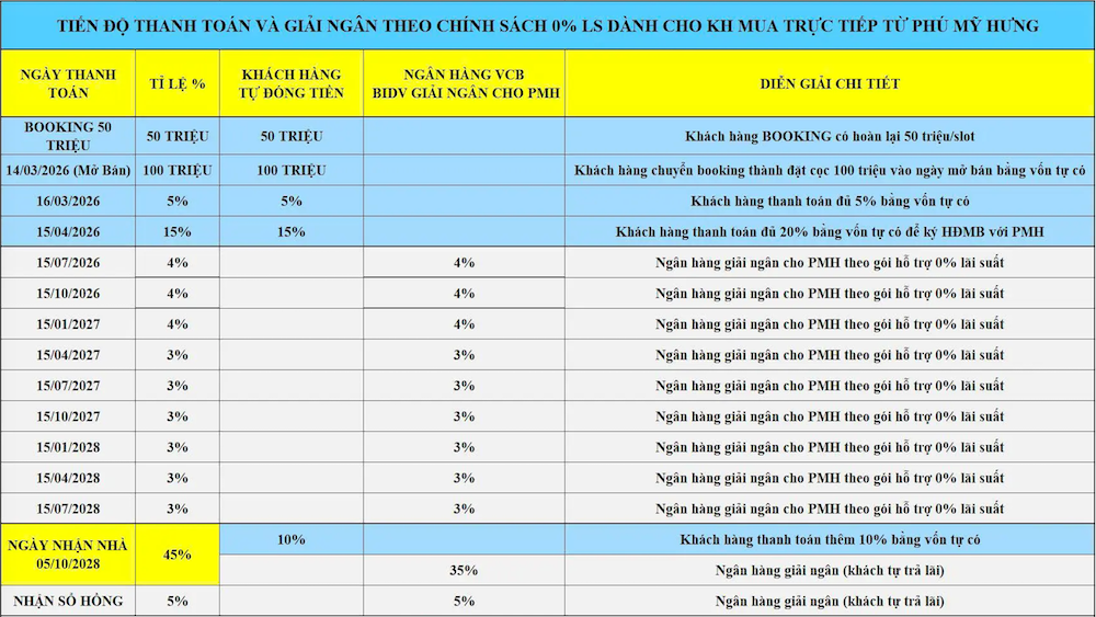 – Giai đoạn đặt cọc: Booking 50 triệu và chuyển thành đặt cọc 50 triệu vào ngày mở bán (19/04/2026).