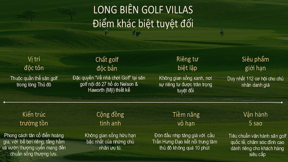 Không phải ngẫu nhiên mà các chuyên gia Savills và Knight Frank đánh giá bất động sản sân golf là một trong 10 loại hình đầu tư xa xỉ nhất thế giới. Tại Việt Nam, Long Biên Golf Villas là dự án biệt thự sân golf duy nhất nội đô, và cũng là tài sản giới hạn chỉ dành cho 112 chủ nhân tinh hoa.