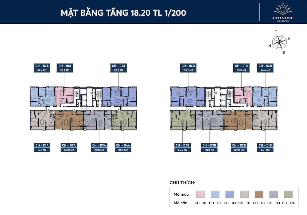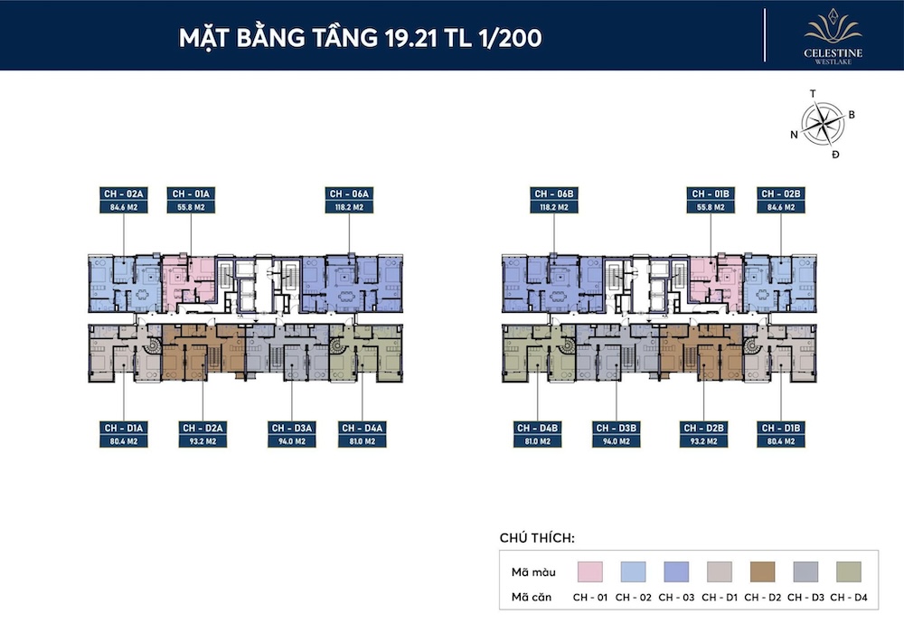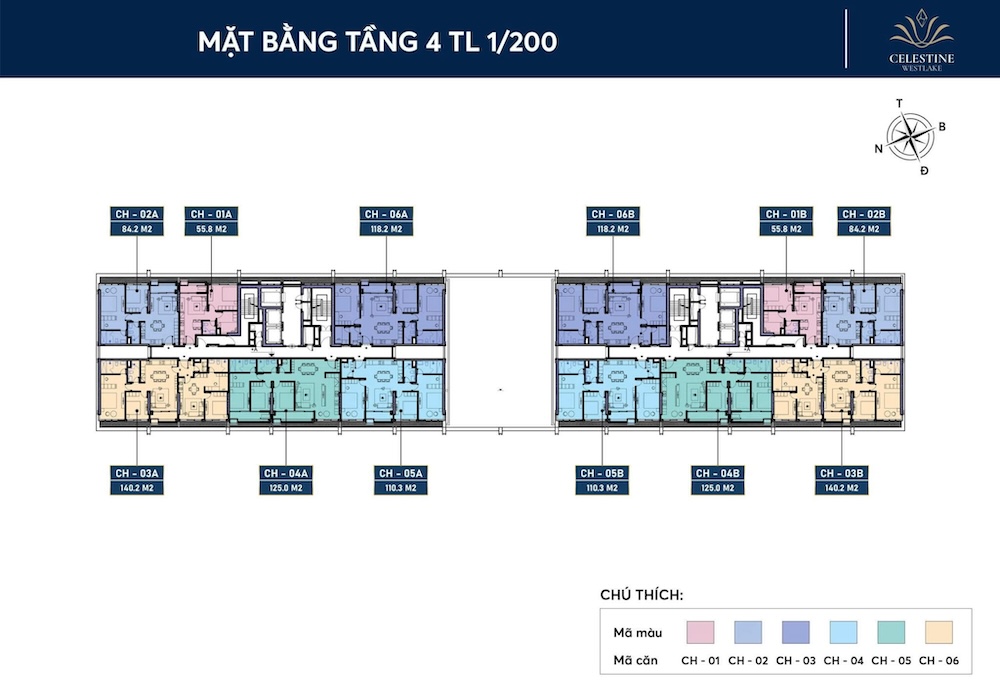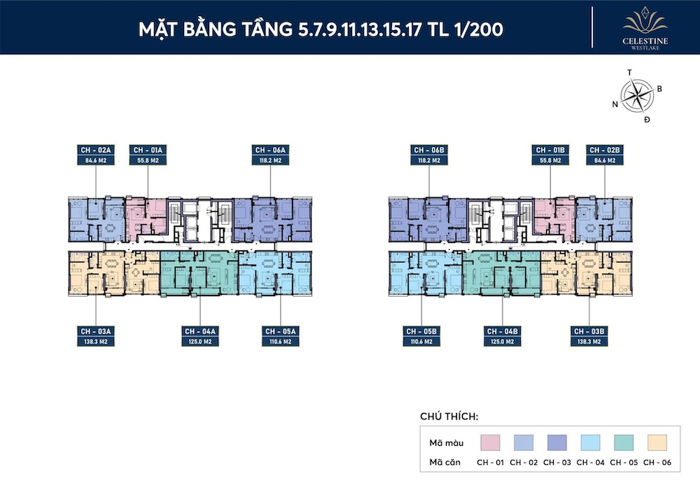 Các căn hộ tại Celestine Westlake được thiết kế đa dạng từ 1 đến 4 phòng ngủ, với diện tích linh hoạt từ 53.2 m² đến 180.3 m², đáp ứng nhu cầu của mọi gia đình – từ người độc thân, vợ chồng trẻ đến gia đình đa thế hệ.