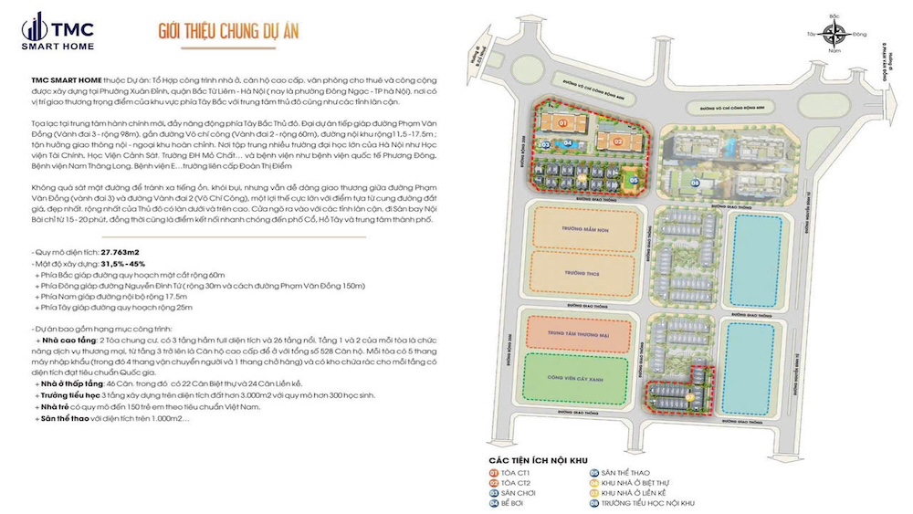 Dự án TMC Smart Home được xây dựng trên một khu đất rộng lớn với tổng quy mô dự án lên tới 27.763m², tạo nên một quần thể kiến trúc hiện đại, hài hòa giữa không gian sống và thiên nhiên. Dự án bao gồm hai tòa tháp căn hộ cao tầng Tòa CT1 và Tòa CT2 cùng khu vực thấp tầng với các biệt thự và nhà liền kề. Với mật độ xây dựng chỉ 31.5%, TMC Smart Home dành phần lớn diện tích cho không gian xanh, đường nội khu và các tiện ích công cộng, đảm bảo một môi trường sống thoáng đãng, trong lành cho mọi cư dân.