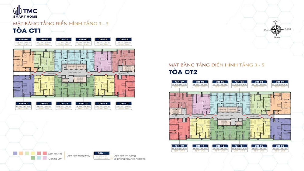 Mặt bằng căn hộ TMC Smart Home được các kiến trúc sư hàng đầu nghiên cứu và thiết kế một cách khoa học, nhằm tối ưu hóa diện tích sử dụng và mang lại sự thoải mái nhất cho cư dân. Các căn hộ tại đây có diện tích linh hoạt, từ 74m2 đến 119m2, với đa dạng loại hình từ 2 đến 3 phòng ngủ, phù hợp với mọi đối tượng khách hàng.