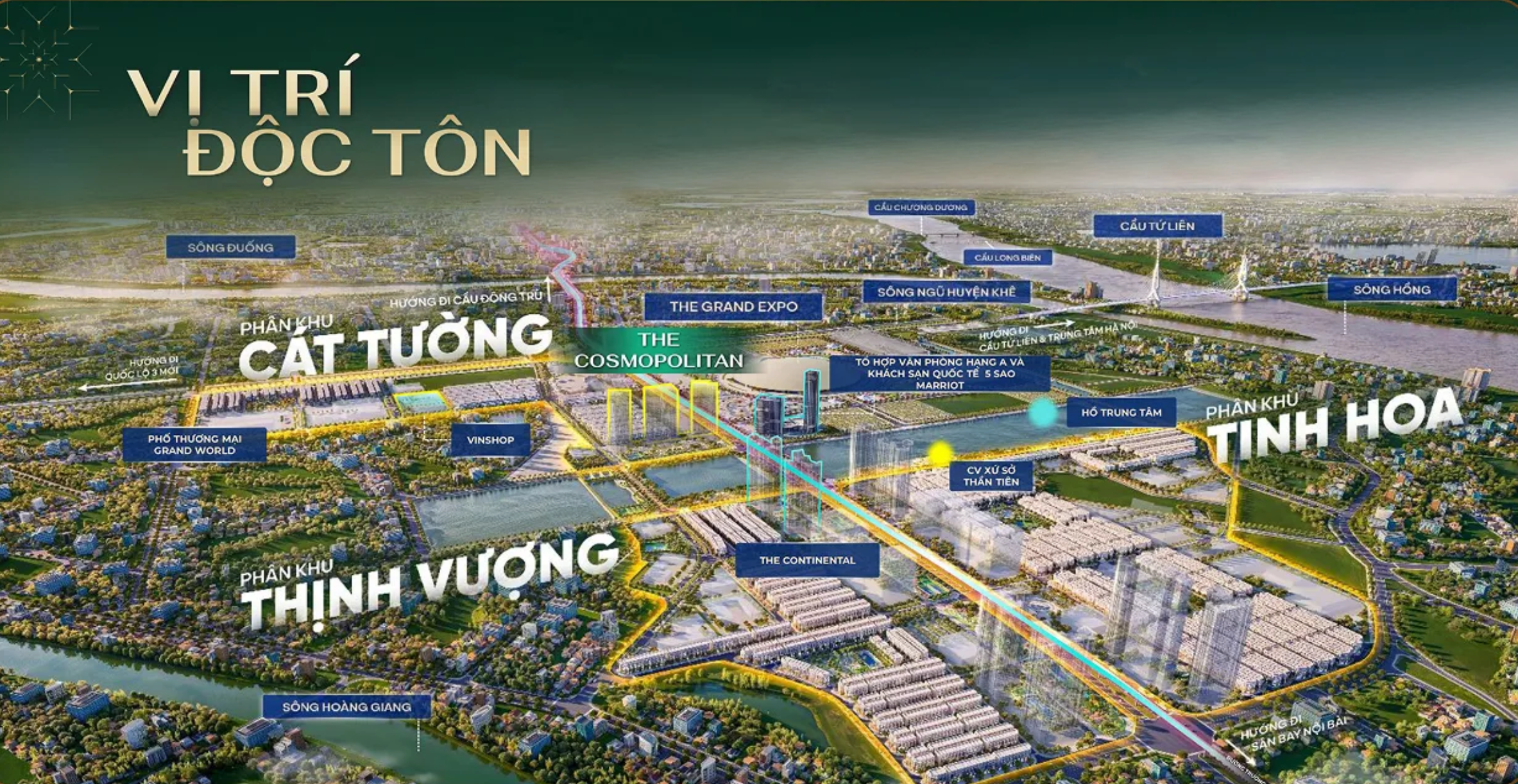 Được biết dự án có tên gọi The Cosmopolitan sở hữu vị trí đắc địa, toạ lạc trên quỹ đất khoảng 3,5ha bao quanh công viên và hồ điều hoà 5,6ha, đối diện trục đường Hoàng Sa là dự án khách sạn 5 sao và Trung tâm triển lãm quốc gia The Grand Expor, nơi hứa hẹn sẽ là điểm đến và là nơi tổ chức những sự kiện tầm cỡ quốc tế tại đây, không chỉ vậy cạnh dự án là công viên Disneyland và hồ điều hoà rộng 32ha cùng khu phố sần uất Grand World thu nhỏ nằm tại phân khu Cát tường, nơi kiến tạo nên giá trị gia tăng của những bất động sản tại Global Gate Cổ Loa.