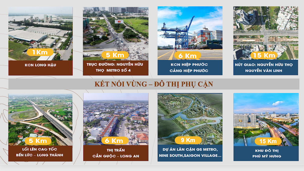 – Chỉ 5-10 phút: Đến KCN Long Hậu, Cảng Hiệp Phước, Cảng Long An.