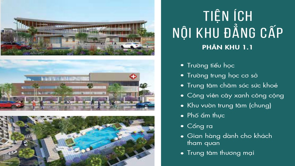 – Tiện ích: Công viên chủ đề, trung tâm thương mại, trường học, bệnh viện, khu thể thao, bến du thuyền, hồ cảnh quan…