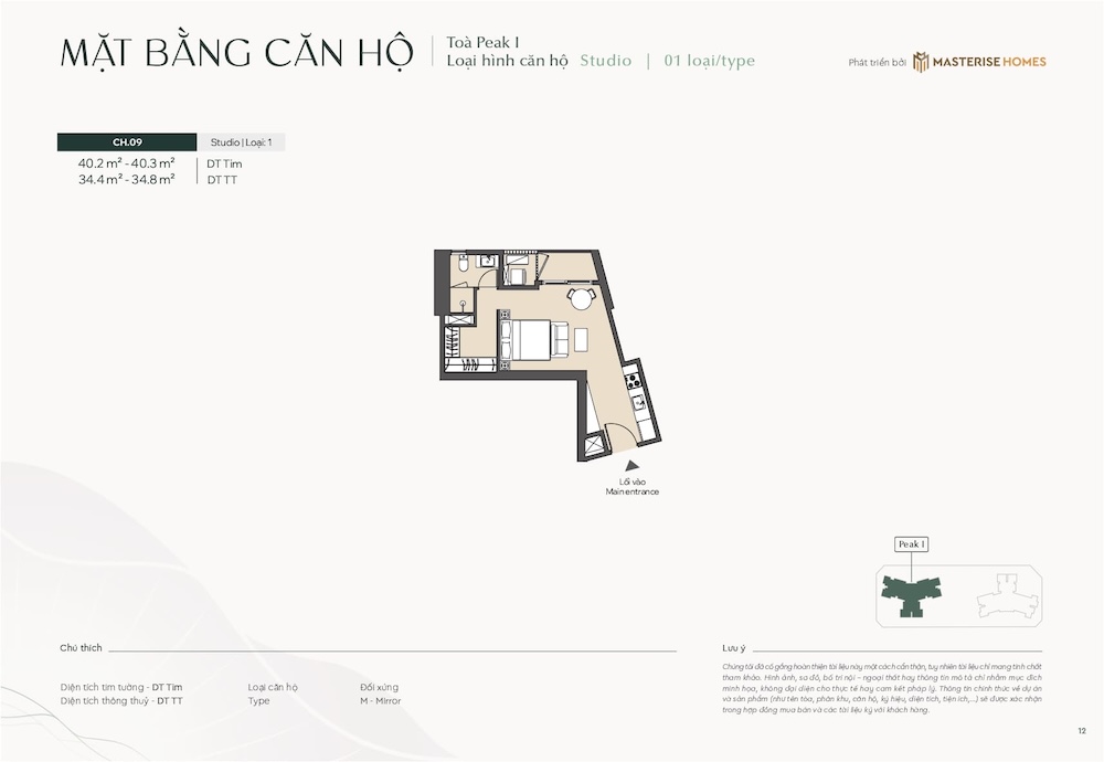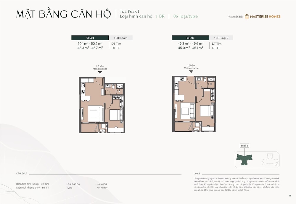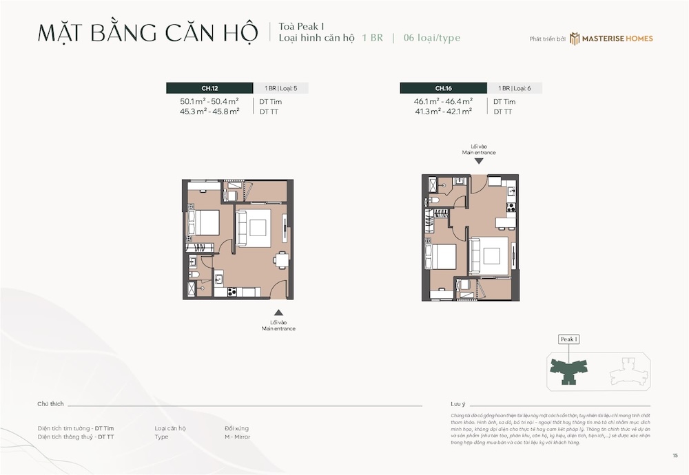 Peak I sở hữu 6 loại căn 1PN, diện tích trải từ 41,5m² đến hơn 50m², điểm chung là: