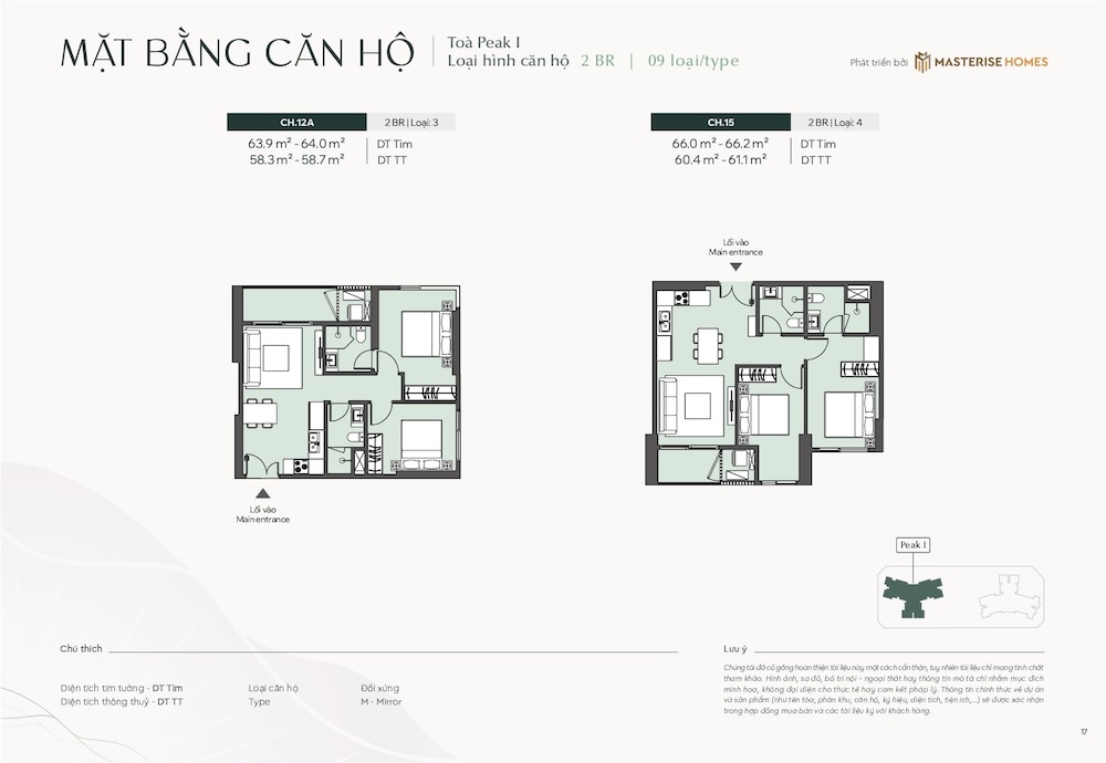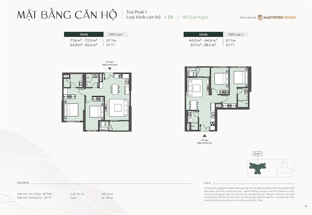 Nhóm căn 2PN tại Peak I được Masterise chăm chút kỹ nhất, với 9 loại layout khác nhau, diện tích linh hoạt từ 63,9m² đến hơn 72m².